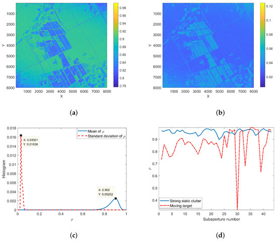 Figure 12a,b are the mean value and standard deviation of the correlation coefficient of 44 adjacent sub-aperture images in the time dimension, and the distribution histograms of the correlation coefficient and its standard deviation are shown in Figure 12c. It can be seen from the figure that the correlation coefficients for the position of the strong static clutter are relatively high, basically above 0.9.