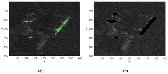 After the detection result of Figure 16a is clustered, there are still many false alarm targets, especially at the edges of strong scatterers or isolated scatter points. The intensity of these pixels is high, but the spatial similarity calculated by the method in Section 3.1 is low, which results in some pixels not being extracted as strong clutter background. In this case, even if Step I and Step II are combined to detect some pixels, false alarms will still be generated. Therefore, it is necessary to use the method in Section 3.3 to solve this problem.