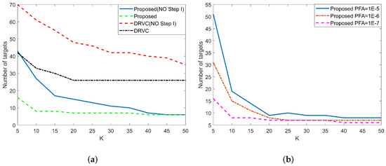 The number of detected targets for various values of K: (a) DRVC and proposed method; (b) under different .