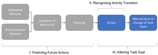 According to Lee et al. [6], intent sensing is composed of three aspects: (i) the recognition and identification of activity transitions, (ii) the inference of task goals, and (iii) the prediction of future activities. See Figure 1 for an illustration of this.