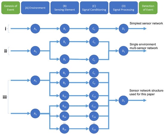 Model of a Probabilistic Sensor Network for event detection (adapted from [11]). The four steps that lead from the genesis of a given event up to its detection are shown at the top of the figure. (i) shows the simplest design, with only one node at each stage. (ii) shows a more complex network, featuring two sensors sharing the same sensing environment, each with their own conditioning step. (iii) displays the network used in this study, with two sensing environments (EMG and IMU sensing), each with 12 sensors, conditioned individually and combined together in the processing step.