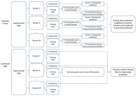 For both the MM (Bayesian Fusion algorithm) and the NMM (Combined KNN algorithm), KNN classifiers were used. The distinct difference between the two was that, for the MM, one KNN classifier was trained for each sensor and then combined, whereas the NMM trained a single classifier using all the sensors as inputs (see Figure 4 for a graphical representation).