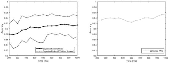 Graphs to show the accuracy of the intent-classification system against the time allowed to pass after the activity’s inception before classification was performed, up to the 1-second limit and with all 24 sensors active (no dropout). These graphs are shown separately to clearly illustrate the presence of a general trend for each algorithm, but comparisons between the two in this context should be avoided (see Section 4.1 for discussion on this). The Combined KNN method does not have confidence intervals, as all the sensors are included and there is no subdivision of the training data, so its performance is entirely reproducible.