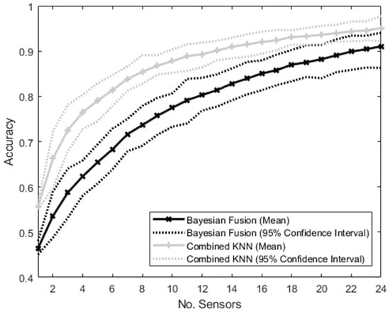 For both algorithms, the classification accuracy increased with the number of sensors. However, as there is no “sensor drop out” in this scenario, the NMM (Combined KNN algorithm) showed consistently better performance than the MM (Bayesian Fusion algorithm).