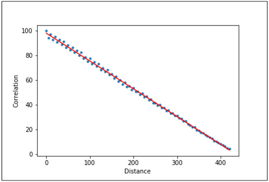 - The similarity correlation between and all other i + n frames is calculated. At the same time, the distance (based on the GPS measurements) between the location of and the location of all other i + n frames is calculated. This information is used to generate a graph presenting the correlation vs. distance (an example of such a graph is presented in Figure 1). This graph allows us to model the change in frame correlation against the GPS distance, which provides a suitable function for the prediction of the next point () on the graph;