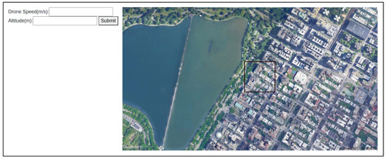 Example of the simulator screen. The drone speed and altitude values are inserted on the left and submitted by the user (by clicking on the “Submit” button); the user clicks on the image and uses the arrows to move the black frame on the map; to finish, the user presses “Enter”.