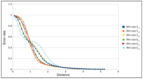 We also investigate how we can determine the optimal window size for our method, the window size that will minimize both the maximum and average errors. For that, we can use the equation: . In Figure 12 and Figure 13, we can see that for an altitude of 50 m the maximum and average errors are obtained for window sizes 4 and 5, while for 100 m they are obtained for window sizes 5 and 6.