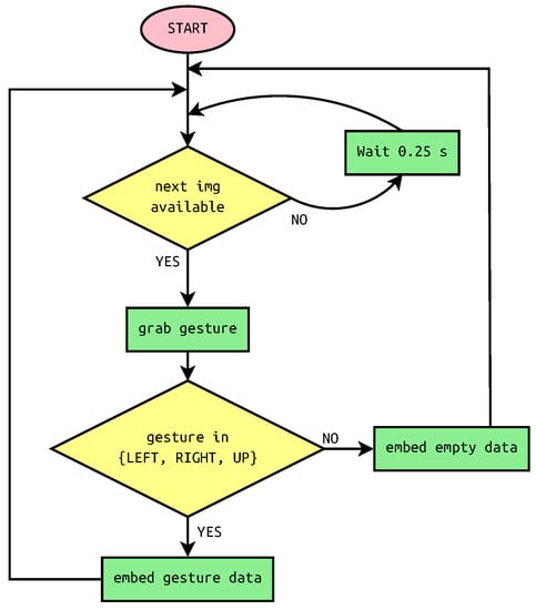 The message from the example takes 90 s to be embedded when the gestures are performed one after another. This is because images are grabbed every 2 s. The system, however, allows for the user to perform gestures at any pace or with breaks. It is achieved by embedding trash data when no meaningful gesture is available. The flowchart of steganographic system in data input mode is presented in Figure 5.