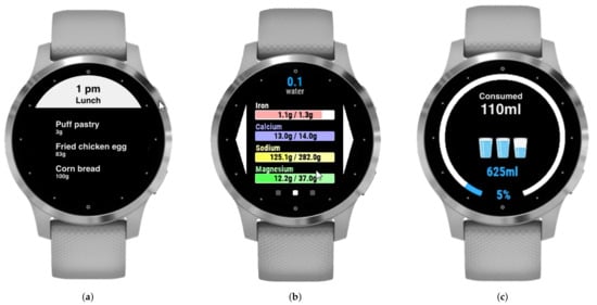 State-of-the-art approaches for automation food intake logging exploit the recognition of food and quantities in images [,] taken using the phone camera and unconventional intrusive devices to detect swallowing patterns associated with calories intake []. Notwithstanding the innovation inherent to these approaches, they suffer from measurement errors summing to the error introduced by food tables to quantify nutrients. Plus, these solutions still require some interaction (e.g., opening the application and taking pictures). A more realistic solution to reduce human interaction costs is integrating the nutritionist and user systems and resorting to off-the-shelf smart devices.