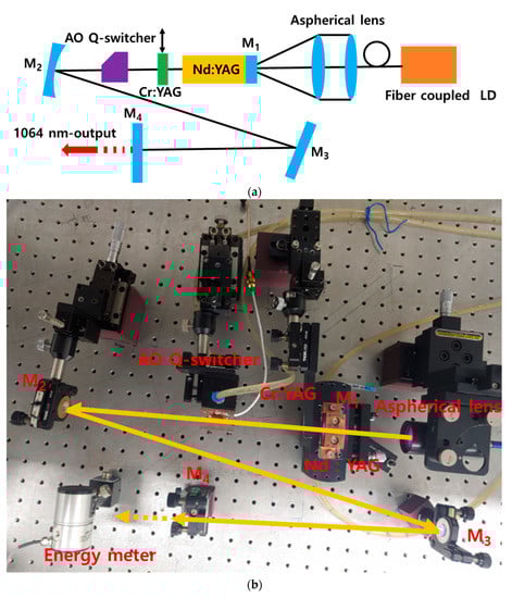 Compared with the passive Q-switched nanosecond pulsed Nd:YAG laser using a Cr:YAG saturable absorber, an active Q-switched nanosecond pulsed Nd:YAG laser using an acousto-optic (AO) device is used as a light source for PA applications that can control the pulse repetition rate. Therefore, it is often used as a light source for PA imaging applications. In this study, a stable Q-switched nanosecond pulsed Nd:YAG laser with an adjustable repetition rate was developed for PA imaging at a lower cost than the existing laser (approximate price) used for PA imaging applications. The pulse width of a Q-switched Nd:YAG laser using an AO device is usually several hundred nanoseconds. In a recent study, a shorter pulsed light source was needed to realize PA imaging []. Therefore, the Q-switched Nd:YAG laser developed in this study is not capable of adjusting the pulse repetition rate, but a Cr:YAG saturable absorber with a shorter pulse width and an AO device capable of adjusting the pulse repetition rate was used to develop a doubly Q-switched Nd:YAG laser. Figure 1a,b shows the resonator structure and implemented system of the doubly Q-switched Nd:YAG laser developed for this study.
