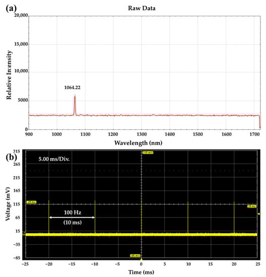 The pulse repetition rate of the doubly Q-switched 1064 nm Nd:YAG laser developed for PA image applications can be determined within the optimal operating frequency of commonly used AO Q-switch devices. As the repetition rate of the pulse laser used in this study was 100 Hz, the AO Q-switch operating frequency of the developed Nd:YAG laser was fixed at 100 Hz. Figure 2a shows the measured spectrum of the doubly Q-switched 1064 nm Nd:YAG laser using an optical fiber-coupled spectrometer (Sol 1.7, BWTEK Inc., Plainsboro, NJ, USA). The center wavelength and linewidth were measured to be 1064.22 nm and about 5 nm, respectively. Figure 2b shows the pulse train of an oscillating Q-switched Nd:YAG pumped by 808 nm LD fixed at 10 W. The pulse train and pulse width were measured by using an InGaAs PIN detector with a rise time of 175 ps (ET-3000, Electro-Optics Tech. Inc., Traverse City, MI, USA) and an oscilloscope at a sampling frequency of 600 MHz and sampling rate of 2.5 GS/s (WaveSurfer 64Xc, Teledyne LeCroy’s Corp., Chestnut Ridge, NY, USA). As shown in Figure 2b, an AO Q-switched pulse with a stable output at 100 Hz was generated.