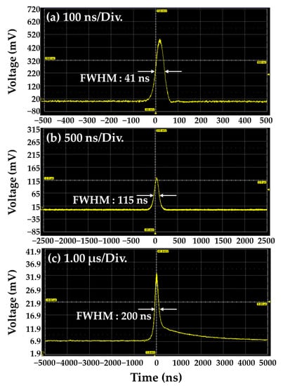 The clarity of the PA image is sensitive to the pulse width rather than the laser energy used. Therefore, it is preferable to use pulses as short as possible. If an active AO Q-switch device is used, the laser can be operated with a stable pulse repetition rate, but the oscillating pulse width is long (≥100 ns) owing to the device characteristics. In addition, the passive Q-switch using Cr:YAG saturable absorber has a disadvantage in that the pulse width varies depending on the pump power or the relaxation time of the used saturable absorber and the resonator length, and the frequency cannot be arbitrarily adjusted. Figure 3 shows the single pulse width for different cases. Figure 3a shows a result obtained by measuring the doubly Q-switched pulse in which both Cr:YAG and AO Q-switch were inserted into the resonator, and a pulse width of 41 ns was obtained. Figure 3b shows a result obtained by measuring the AO Q-switched pulse in which the Cr:YAG saturable absorber (a passive Q-switch element in the resonator) was removed and only the AO Q-switch was inserted into the resonator. At this time, a pulse width of 115 ns was obtained. Figure 3c shows a result obtained by measuring the passively Q-switched pulse in which only Cr:YAG was inserted into the resonator, and a pulse width of 200 ns was obtained. Compared to the actively Q-switched 1064 nm Nd:YAG laser by inserting only an AO Q-switch, the doubly Q-switched 1064 nm Nd:YAG laser provides shorter pulse width by 1/3. Therefore, we expect that a clear PA image could be obtained. For experimental conditions, the output power of the 808 nm pump LD was fixed at 10 W, and the operating frequency of the AO Q-switch was fixed at 100 Hz.