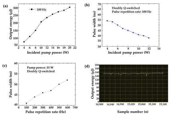 Characteristics of developed doubly Q-switched 1064 nm Nd:YAG laser. (a) Comparison of output energy according to incident pump power, (b) comparison of output pulse width according to incident pump power, (c) comparison of output pulse width according to pulse repetition rate, (d) stability of output energy, according to the sample numbers.