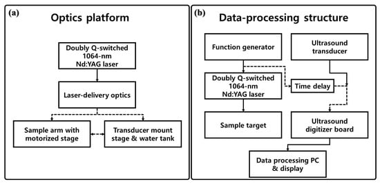 We constructed an imaging system to obtain PA signals using the doubly Q-switched 1064 nm Nd:YAG laser. The connection structure for the modules of the implemented PA imaging system is shown in Figure 5.