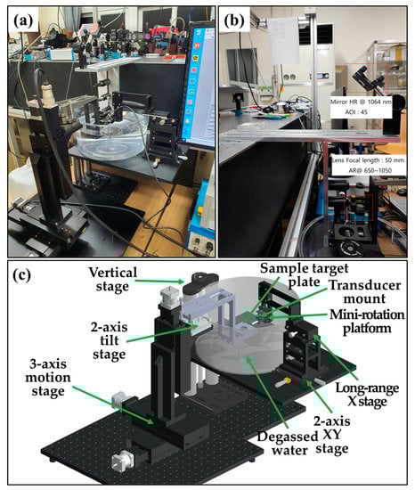 Figure 6c shows the overall structure of the fabricated sample. As shown on the left side of Figure 6c, the sample arm with a motorized area was implemented separately with a 500 × 500 mm2 aluminum breadboard. As shown on the right side of Figure 6c, the transducer mount stage and water tank were composed of a 300 × 300 mm2 aluminum breadboard. In the transducer mount stage and water tank area, the vertical stage (VAP10/M, Thorlabs Inc., New Jersey, NY, USA) was used to adjust the water tank height (~254 mm), the transducer mount (VC1/M, Thorlabs Inc., New Jersey, NY, USA) was used to change the thicknesses (0.5–20.8 mm) of the transducer, the mini-rotation platform (MSRP01/M, Thorlabs Inc., New Jersey, NY, USA) was used to adjust the transducer angle in the sample direction, the long-range (±30 mm) X stage (XDTS90, Impsystem Inc., Gumi, Korea) was used to move the transducer to sample plate, and a 2-axis XY stage (XYT1/M, Thorlabs Inc., Newton, NJ, USA) was responsible for the fine adjustment of the transducer position (~13 mm). The sample image experiment was performed by positioning the sample target and adjusting the vertical stage in a water tank filled with degassed water.