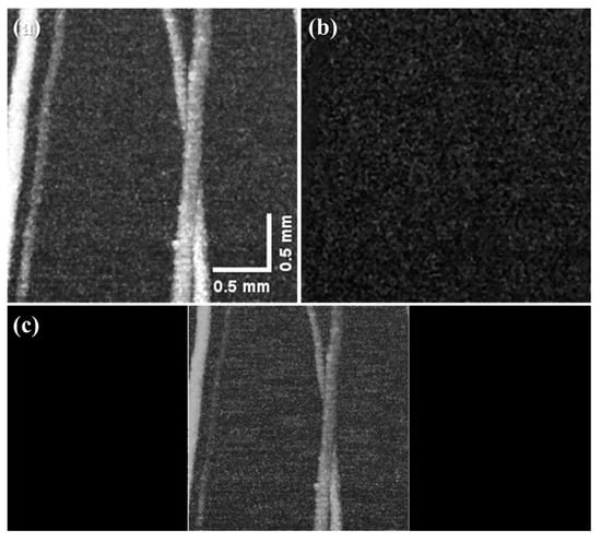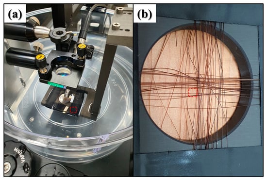 As shown in Figure 7, the image acquisition experiment using the PA system was conducted in two areas: the first area where the hairs are separated because of their height differences and intersections, and the second area where insulating tape is superimposed. In Figure 7a,b, the area photographed in the experiment is indicated by the red dotted lines. A 15 MHz and 0.25 inch focused ultrasound transducer (Olympus Inc., Shinjuku, Toyko, Japan) was used. Figure 8 shows the processed image results for the obtained PA signals.