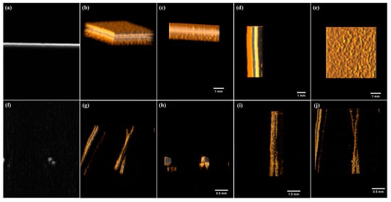 Experimental results for the PA imaging system obtained using insulating tape and hair: (a) original imaging result for insulating tape; (b) 3D reconstruction result for insulating tape; (c) insulating tape imaging result view of x- and y-axes; (d) result view of y- and z-axes; (e) result view of x- and z-axes; (f) original imaging result for the hair; (g) 3D reconstruction result for the hair; (h) hair imaging result view of x- and y-axes; (i) result view of y- and z-axes; (j) result view of x- and z-axes.