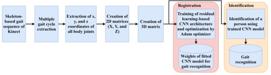 There are two phases for the Kinect-based gait recognition. During the registration phase, features are extracted by the proposed convolutional neural network using residual learning from the skeleton-based gait sequences. Extracted features in different layers of the CNN model are trained and optimized during the registration phase. Optimized features are used during the identification phase. During the identification phase, unknown Kinect skeleton-based gait sequences are used. The trained CNN model is applied to the prediction of a person’s identification. The flowchart of the proposed system is shown in Figure 1.