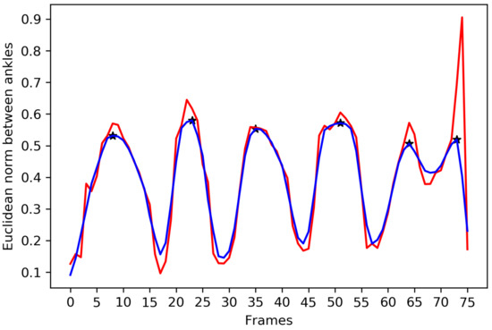 Euclidean norm between ankles is shown in red color. The result of noise reduction filters is shown in blue color. Local maxima is marked using the * symbol.