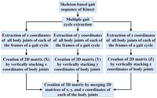 Three-dimensional (3D) coordinates of each of the body joints over a gait cycle are used to generate a unique 3D matrix. Each of the body joints is represented using an vector in the Kinect skeleton model. The number of body joints and the number of frames in a gait cycle are represented by and , respectively. The x coordinates of body joints are extracted from each of the frames of a gait cycle. In a similar way, number of y and z coordinates are retrieved. The flowchart of the 3D matrix generation process using the x, y, and z coordinates of each of the body joints over the frames of a gait cycle is shown in Figure 3. Since the number of frames in a gait cycle is not the same for every person, the value of is different from person to person.