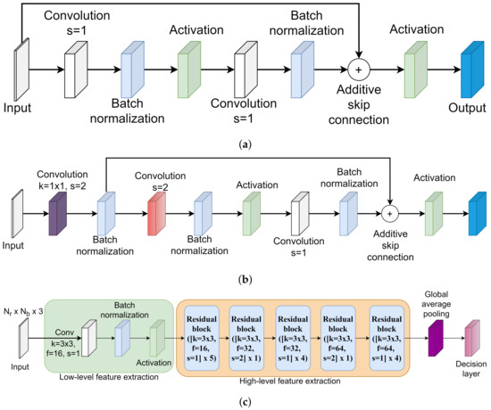 There are two types of residual blocks introduced in the proposed architecture in order to extract the hierarchical high-level feature map. The residual block takes the output of the previous layer, size of the kernel, number of filters, and stride length as an input. If the stride length is set to 1 in the residual block, the architecture of the residual block shown in Figure 4a is selected. On the other hand, if the stride length is set to 2 in the residual block, the architecture of the residual block shown in Figure 4b is applied. When the stride length is set to 1, the skip connection is introduced from the input matrix to the results of the batch normalization layer (see Figure 4a). To implement the skip connection, the merging layer of the addition type is used to add the original input matrix to the residual block and the output of the batch normalization layer. The merged results are fed into the ReLU activation layer. When the stride length is set to 2, a convolution operation is applied at first using the provided number of filters with kernel. Next, the batch normalization layer is used to normalize the outputs. Consider the result of this batch normalization operation is represented as . The shortcut connection is added from to the results of the batch normalization layer, according to Figure 4b, using the merging layer of addition type. The merged results are passed to the activation layer. The architectures of Figure 4a,b with skip connection are included in the KinectGaitNet to address the degradation problem, since the high-level feature extraction block is a deeper network.