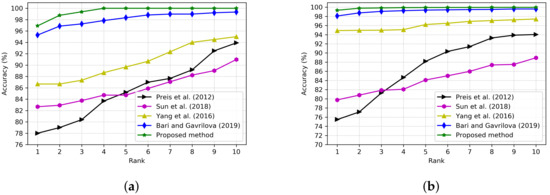 The performance of the proposed method is compared with the methods [4,5,23,26]. Comparisons of rank-1 to rank-10 CMC scores of the proposed method with the studied prior research on the UPCV dataset and KGB dataset are shown in Figure 6a,b, respectively. The proposed method achieves 100% accuracy at rank-4 on the UPCV dataset, whereas prior research can not achieve 100% accuracy at rank-10. On the other hand, on the KGB dataset, rank-1 recognition accuracy is 99.33%. The recognition accuracy of 99.98% is achieved at rank-10, whereas 88.95%, 94.03%, 97.42%, and 99.60% recognition accuracies are achieved at rank-10 by the state-of-the-art methods [4,5,23,26], respectively. In summary, the proposed method achieves a higher identification rate at each rank than the comparators on both datasets.