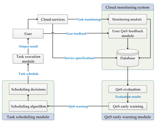 This paper is mainly composed of two modules, user QoS evaluation and early warning module and task flow scheduling module. The cloud service monitoring system is a supporting module and will not be introduced in detail in this paper. From Figure 1, it can be seen that when a user purchases and runs a cloud service, the monitoring module keeps track of the running status of the service and collects data. At the same time, it collects feedback information from the user, and then stores the information in the monitoring database.