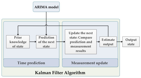 In the context of state space models, Kalman filter [] is an algorithm for estimating unknown variables based on observations collected over time. This algorithm has proven to be effective in a variety of applications. Kalman filters are simple in design and need little computation time. However, because the Kalman filter can be applied to any state space model, it is used in this paper to fit the ARIMA model presented previously. As a result, combining Kalman filter with ARIMA could result in more accurate predictions thanks to optimal estimations []. A detailed description of the algorithm is presented in [].