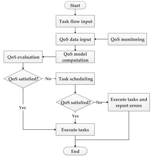 Figure 4 shows the task scheduling process based on user QoS guarantee. First, the system obtains a user’s task flow input according to the user’s task request and user QoS. The submitted task run in the virtual machine in the cloud system. During operation, the monitoring system can obtain various monitoring information about the task and the virtual machine, and calculate the current status of the user’s QoS. Then, the current QoS state is evaluated. If the evaluation result complies with the QoS evaluation model standard, the task will continue to be executed until the end. If the evaluation result shows that the user’s QoS is in a dangerous state or exceeds the normal range of the user’s QoS, then in the next task scheduling, a scheduling scheme that is beneficial to the user’s QoS will be calculated and scheduled. The monitoring of QoS status of tasks continues after scheduling until the task ends. If the evaluation results after scheduling still cannot meet the user’s QoS, the system will issue an alarm.