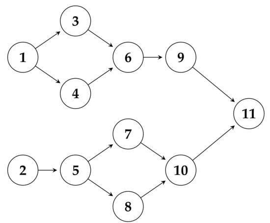 The task flow in cloud computing can be regarded as a topological sequence, such as in Figure 5, which is a directed acyclic graph (DAG). Each node in the graph represents a cloud task, and each edge represents the execution order of the tasks. Now, map the tasks to the particles in the PSO algorithm: each particle in the algorithm is a solution and represents a scheduling scheme. The dimension number of a particle corresponds to the number of the tasks, and the value of the space dimension indicates the number of the virtual machine to which the task is deployed. The dimension of the particle is , where n represents the number of tasks to be scheduled. Particles are constantly moving in space to search for a best scheduling scheme of the task. The quality of the scheduling scheme is judged through a fitness function. Because each particle represents a solution, the larger the number of particles, the larger the search space, but too much search will bring additional overheads. Generally, the number of particles will be greater than the number of tasks.