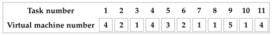 The task corresponds to the assigned virtual machine number. It can be seen from Figure 6 that each task number corresponds to an assigned virtual machine number, which can be represented as a slice of a particle in one dimension in a certain number of iterations. Figure 6 indicates which virtual machine tasks 1 to 11 are allocated to. This allocation method can be represented by an 11-dimensional particle, and the number on the 11th dimension of the particle represents the virtual machine number. The solution corresponding to the task assignment strategy can be represented by a particle in the particle swarm. The dimension of the particle corresponds to the task number, and the number of the spatial position of the particle corresponds to the assigned virtual machine.