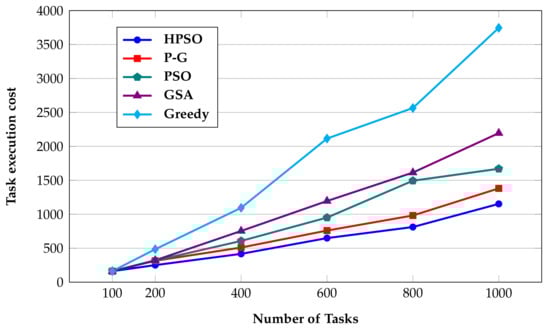As can be seen from Figure 9, the greedy algorithm increases the task execution cost significantly when the number of tasks increases, because it is prone to generate local optimal solutions, which is not obvious when the number of tasks is small. However, when the number of tasks increases, the shortcomings become obvious. The GSA algorithm has significant improvement over the greedy algorithm, but it is slightly worse than P-G and PSO algorithms. This is because the global search ability of the gravitational search algorithm is relatively poor, and the particles can form a good local search ability due to the gravitational interaction between each other. However, gravity is a search technique that keeps particles confined to nearby spaces, rather than spreading out across other spaces. Although the PSO algorithm has limited global search capabilities, a higher initial velocity can be given to the particles to optimize its global search ability. Therefore, the performance of PSO is slightly better than GSA.