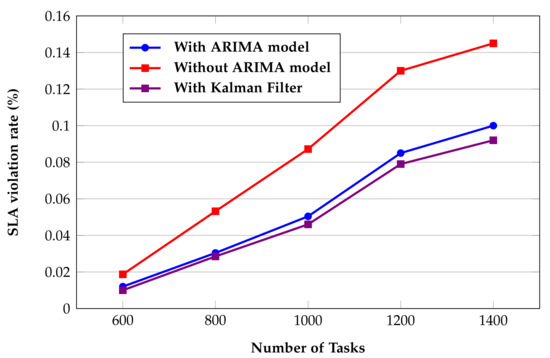 The values of p, d, and q in the ARIMA prediction model used in this paper are 2, 0, and 2, respectively []. The ARIMA model is optimized by using the Kalman filter JAVA package of the Efficient Java Matrix Library (EJML) (http://ejml.org/, accessed on 7 March 2022). It can be clearly seen from Figure 10 that the SLA violation rate is significantly better than without the prediction model. Since the ARIMA model is based on historical information and the current server status prediction, and due to the uncertainty of user task execution, it still cannot fully guarantee user QoS. The prediction model cannot achieve good results when physical resources are insufficient. It is found through experiments that when the number of tasks reaches 1400, the SLA violation rate using the prediction model is reduced by 0.045%. In addition, Figure 10 shows that the Kalman filter improved the ARIMA prediction model. Indeed, the SLA violation rate was reduced by 8% when using Kalman filter.