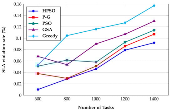 SLA violations occur when cloud service providers fail to provide services in accordance with SLA to users. The QoS guarantee in this paper, as part of the SLA, primarily ensures that the user’s tasks are completed on time, and does not include any further economic or legal guarantees. In this paper, the completion time of each task must not exceed a predefined deadline. Thus, SLA violation rate is defined as the percentage of tasks that are unable to be completed by their deadline. Figure 10 presents the effect of the prediction model proposed in this paper, and Figure 11 presents the comparison of the algorithms in term of SLA violation rate.