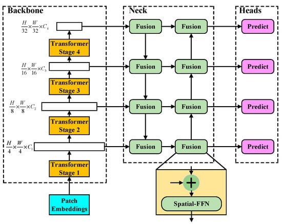 Neck is used to collect and strengthen different feature maps, and a neck consists of multiple bottom-up paths and top-down paths. The PANet structure adopts bottom-up path augmentation to recover the corrupted information between each proposal region and all feature levels through adaptive feature pooling, and its structure is shown in Figure 4a. RODFormer uses the bidirectional fusion method shown in Figure 4b to enhance the feature information of the image. All features adopt the spatial-FFN structure. RODFormer changes the global channel of FFN through spatial-FFN, avoiding the structural complexity of CNN and the limitations of FFN.