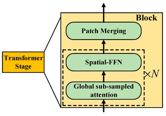 For each patch of the image, ViT uses the patch-merging method to unify the N × N × 3 patches into a 1 × 1 × C vector to obtain a hierarchical feature map. However, ViT is used to combine non-overlapping feature blocks and cannot maintain the local continuity of patches. Therefore, according to reference [], the overlapping patch-merging method is used to convert the feature dimensions of different patches into C1, C2, C3 and C4, respectively, and then send them into the Transformers block.