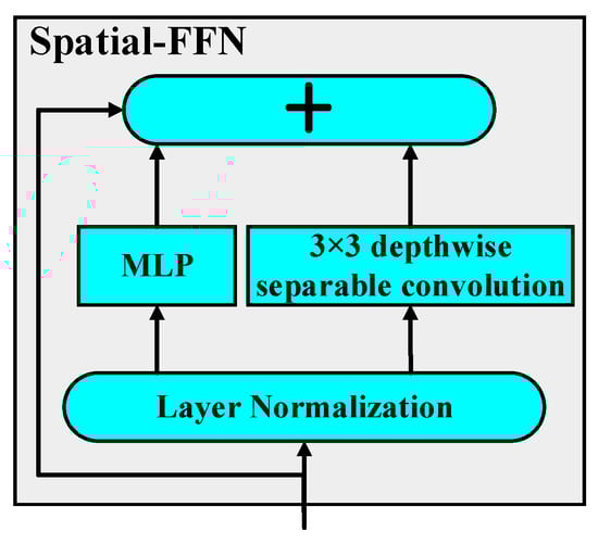 However, the attention in Transformers is position-invariant and requires position embedding to determine feature information. At the same time, FFN lacks spatial local modeling capabilities, and CNN adds complexity to the network structure. Therefore, RODFormer introduces spatial-FFN, which integrates the global capability of FFN and the local capability of 3 × 3 depthwise separable convolution [] by means of upsampling through layer normalization []. Because point-wise convolution and position-wise FFN are equivalent, introducing spatial-FFN to each Transformers block enables modeling of local spatial relationships through the network. The built-in properties of spatial-FFN allow for the removal of location information in the network without affecting performance, which both strengthens the local modeling effect of the network and avoids the structural complexity of CNNs. The structure of spatial-FFN is shown in Figure 3.