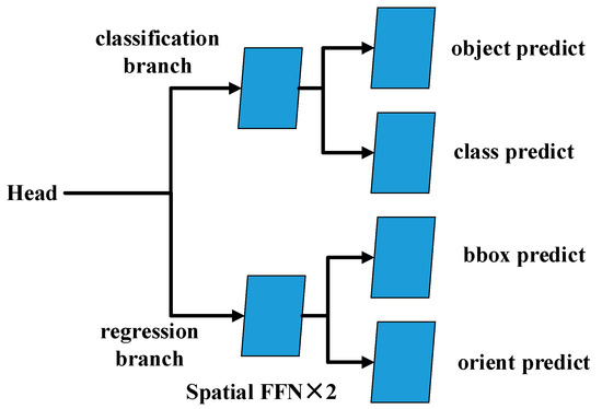Using structured transformers, 4 parallel output predictions are obtained for the 4 layers of transformer stages. Head includes a classification branch and a regression branch, which both use spatial-FFN to predict image features. The structure of the head is shown in Figure 5. The classification branch is mainly used for the classification of objects and object categories, and the regression branch is mainly used for the regression processing of the rotation frame. To reduce the complexity of the structure, RODFormer adopts a first-order, anchor-free mode, which reduces the prediction of each position from 3 to 1. RODFormer directly predicts the two offsets of the grid center point, as well as the height and width of the predicted box.