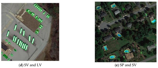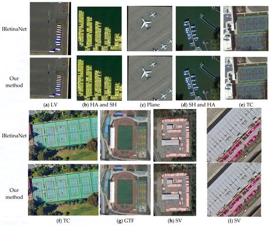 To visually display the target-detection effect of RODFormer, some image-detection effects of RODFormer and IRetinaNet in the DOTA dataset are visualized, and the results are shown in Figure 7. Figure 8 shows the visualization results of RODFormer in some categories of images in the DOTA dataset.