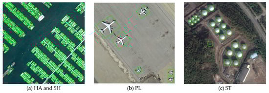 The DOTA dataset consists of 2806 aerial images with 188,282 instance objects annotated by horizontal boxes and rotated boxes. The DOTA dataset has 15 common detection object categories, including plane (PL), baseball diamond (BD), bridge (BR), ground track field (GTF), small vehicle (SV), large vehicle (LV), ship (SH), tennis court (TC), basketball court (BC), storage tank (ST), soccer ballfield (SBF), roundabout (RA), harbor (HA), swimming pool (SP) and helicopter (HC). The training set, validation set and test set in the DOTA dataset comprise 1411, 458 and 937 entries, respectively. The size of the images is between 800 × 800 pixel and 4000 × 4000 pixels. Due to the large variation range of objects in the DOTA dataset (10–50 pixels), testing against the DOTA dataset has more practical application value.