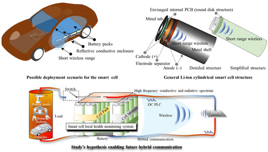 A battery-management system (BMS) mitigates these limitations by employing an active monitoring of the battery’s state, such as state of charge (SOC) and state of health (SOH) [1,2,3]. Saving weight and lowering expenses as a result of the cells’ combination into large-scale battery systems demand that the BMS technology focus on power line communication (PLC) [4,5] and wireless solutions [6,7].