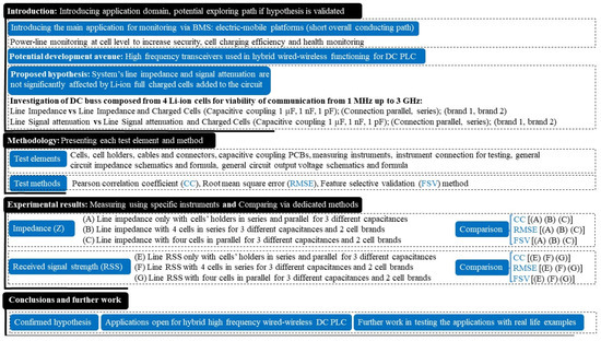 The work is structured in four main sections. In the introductory section, the overall topic and suggested technical gap that may allow an effective hierarchical BMS communication solution for e-mobile platforms is presented. The hypothesis that will guide the empirical investigation in the following section is also formulated in the first section. In the second section, we describe each testing element and the statistical tool used to compare the direct measured data streams. While a review of the system’s impedance measurements, position and output voltages is required for the empirical data collection, no numerical or analytical modelling of impedances and voltages will be pursued, since all are based on equivalent simplified circuits. To determine the cell’s influence on the system parameters of interest, the high number of measurement results for each scenario will be compared in pairs in section three. The statistical methods will demonstrate the similarity or dissimilarity of the data, and the fourth section will summarize the findings and state the potential benefits of the work. Figure 2 schematically illustrates the proposed framework for this study.