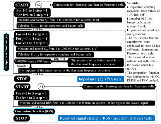 A pseudocode representation of the investigation stages can be found in Figure 3 due to the large number of analysed data used and their different combinations used for comparison. Using the vector network analyser (VNA), the measured scattering parameters (i.e., S parameters) are converted into real impedance values for the interval between 1 MHz and 3 GHz in order to measure the system’s impedance variation with and without Li-ion cells. Since two cell manufacturers are available for testing, each test is conducted subsequently for each brand (i.e., “×2”). In addition, after comparing the series and parallel combinations for all three capacitive coupling values to determine the difference between an empty system and a populated one’s impedance, the same comparison is made between the two cell brands to see if any differences exist. Next, the same algorithm is applied to the received signal strength (RSS), but instead of the VNA’s ports, a signal generator for the transmitter and a spectrum analyser for the receiver are used. In order to illustrate the end limits for the potential budget link calculation, the spectrum interval is also recorded at its maximum and minimum values. Further comparisons are carried out on the RSS averaged values in the same manner as described for the impedance parameter. Next, each testing element and method will be presented briefly, and their selection explained in the study’s context, following the proposed illustrated investigation methodology.