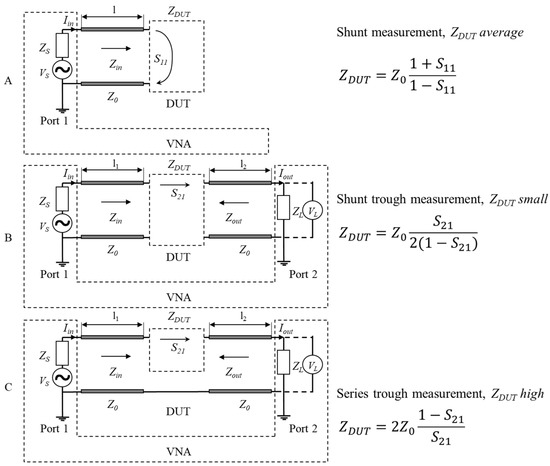 Vector network analyser (VNA) measurements setup for device under test’s (DUT’s) impedance measurements: shunt (A); shunt through (B); series through (C).