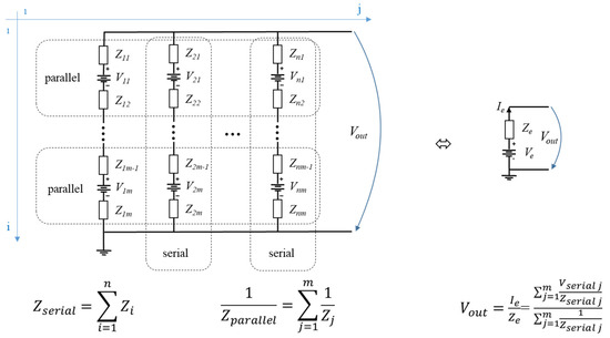 Output voltage of a battery network connected in series up to n and parallel up to m, transforming first by summing on each column the serial equivalent voltage, currents and impedances, then summing the equivalent voltages, currents and impedances for parallel configuration on the remaining row.