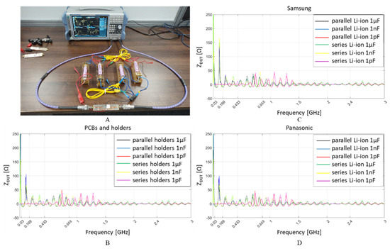 VNA impedance measurements setup (A); for 1 µF, 1 nF and 1 pF capacitive coupling to: the empty system (i.e., no Li-ion cells present inside holders) (B); four Li-ion Samsung 18650 cells connected in parallel and series (C); four Li-ion Panasonic 18650 cells connected in parallel and series (D).