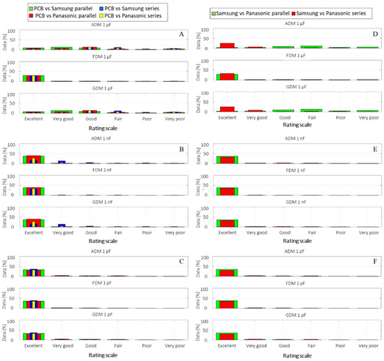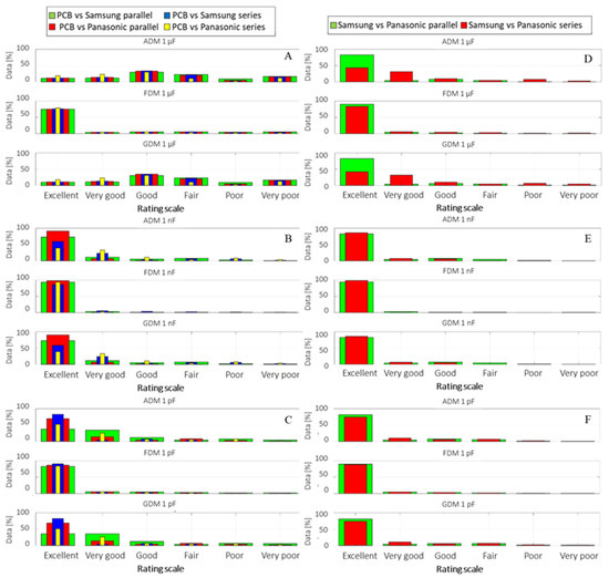 The FSV bar graph comparison reveals an almost similar result as for the VNA measurement setup, reinforcing the consistency of the experimental setup and measurements. With respect to the previous observation regarding ADM low indications for the 1 µF coupling when compared with 1 nF and 1 pF (i.e., similarly for impedance measurements), the ADM scale results are showing an approximate agreement level of 15–20% between the first four ratings: Excellent, Very good, Good and Fair. This may indicate that although both data series are following the same graphical trend, their scale values may be sifted.
