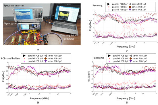 Spectrum analyser received signal strength (RSS), attenuation measurements setup (A), for 1 µF, 1 nF and 1 pF capacitive coupling to: the empty system (i.e., no Li-ion cells present inside holders) (B); four Li-ion Samsung 18650 cells connected in parallel and series (C); four Li-ion Panasonic 18650 cells connected in parallel and series (D).