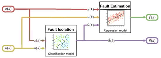 Another direction to deal with the problem of fault diagnosis in non-linear systems is related to the use of machine learning and deep learning techniques. The issue of Fault Isolation, in fact, can be easily set as a direct application of a classification or clustering problem. At the same time, ML regression techniques can also be employed for estimating the shape and amplitude of the fault (Fault Estimation (FE)) [,,,].