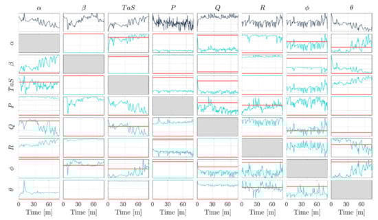 In Figure 2, the time evolution of the local fault sensitivities produced by the training data under no-fault conditions for a time segment of 1 h and 21 min is shown. A blank cell in the figure means that the MARS algorithm has not selected that signal in the corresponding additive model. The first row shows the monitored sensor readings [], while the other rows in the figure represent the time-dependent sensor fault direction at time (cyan). In other words, the -th column represents the evolution of the components of the vector (see Section 2). The figure also reports in red the fault sensitivities for the linear model case (fault directions) that are constant over time. In the last case, the -th column represents the constant components of the vector , as shown in Section 2.1. A detailed analysis of the data reveals that the time intervals where the local faults sensitivities change significantly are those in which the aircraft is executing a maneuver. The significant variation of the fault directions with time suggests a probable relevant effect on the FI performance compared to the linear case.